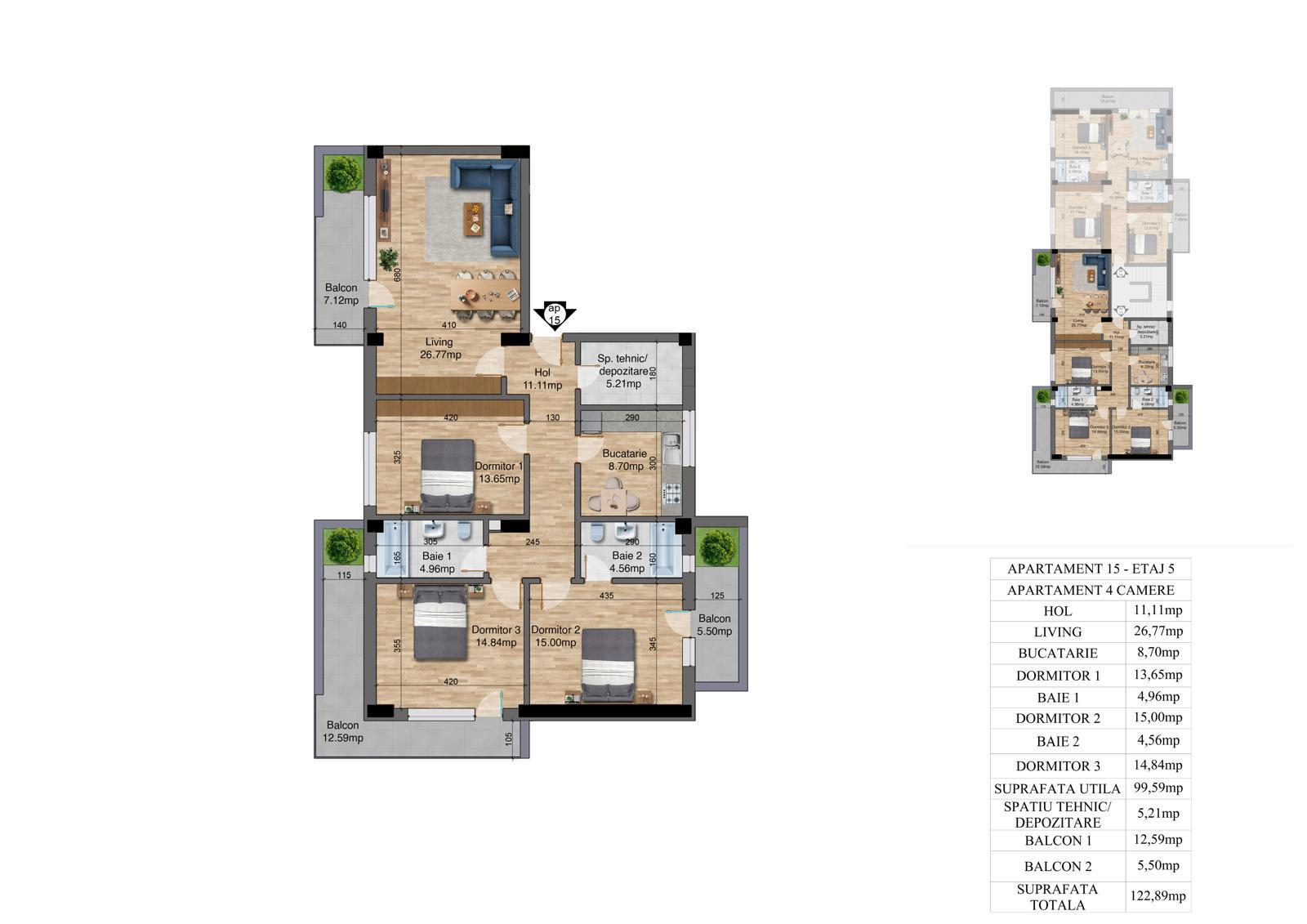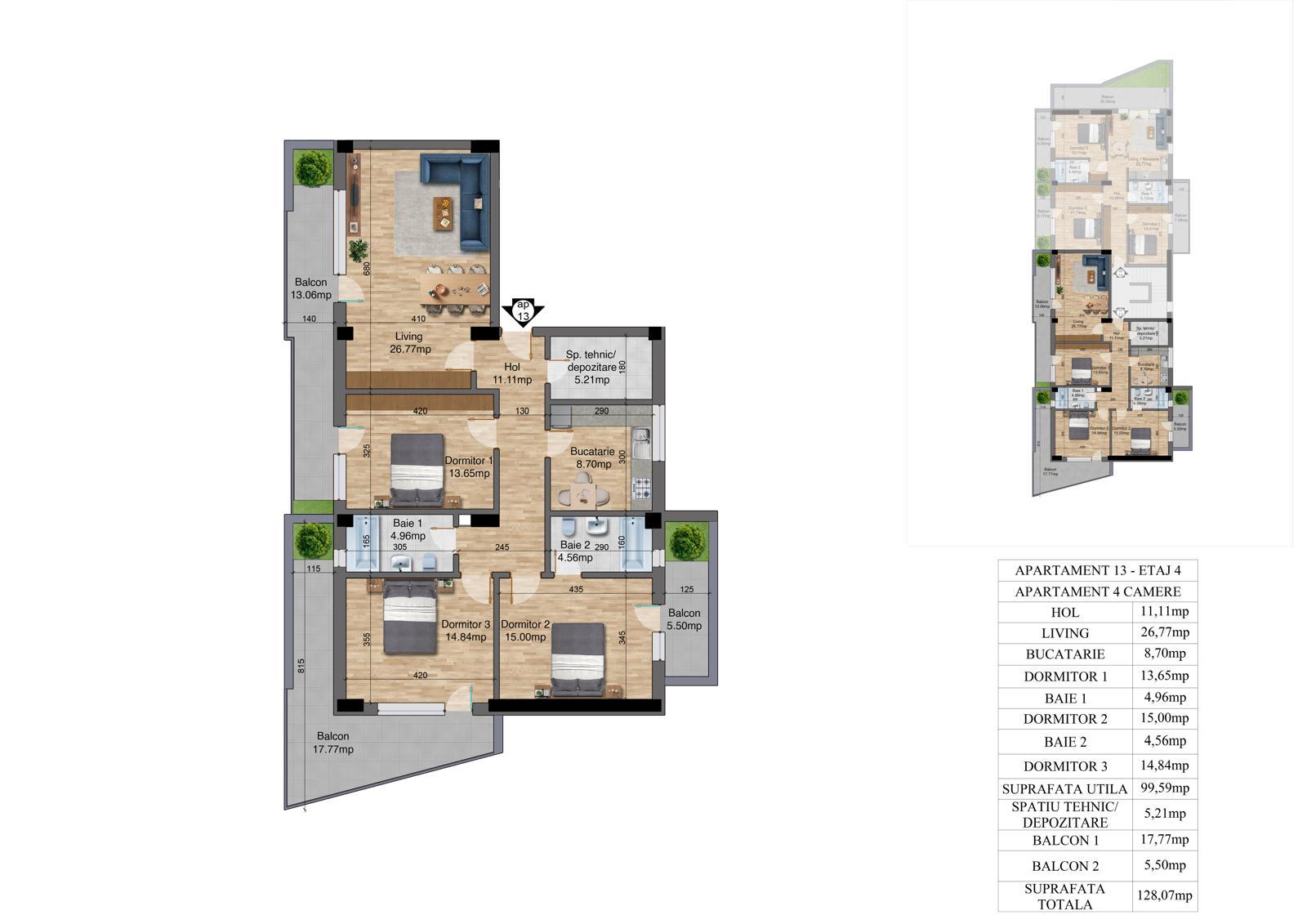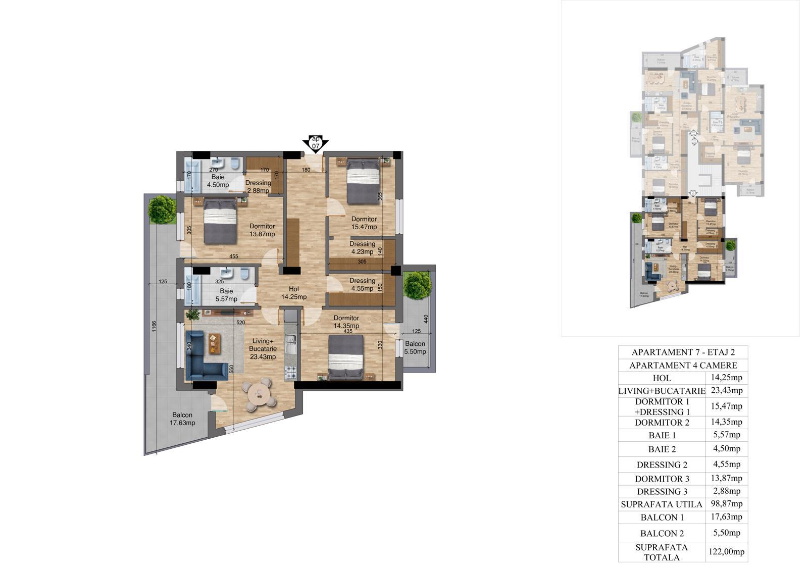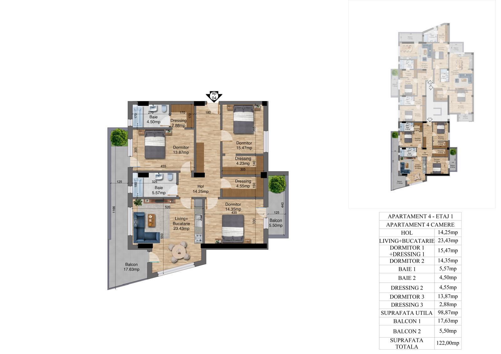 | 4 | 4 camere – Etaj 1 | 98.87 | 122 | Disponibil |