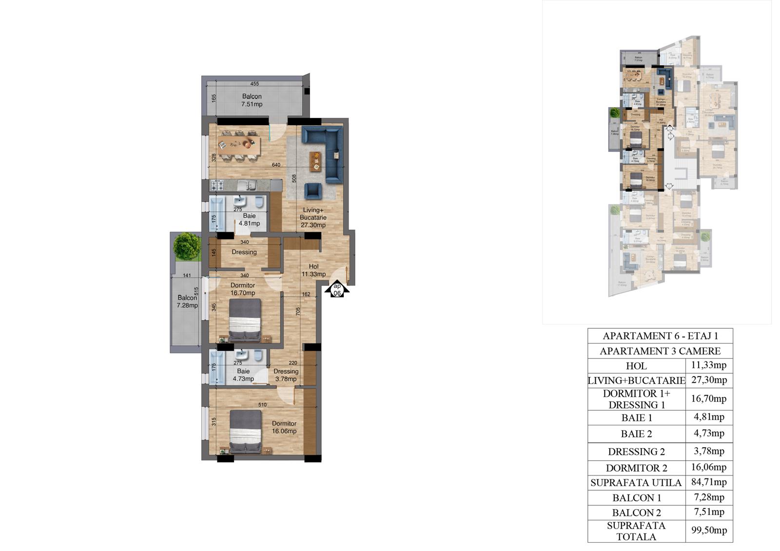 | 6 | 3 camere – Etaj 1 | 84.71 | 99.50 | Vândut |
