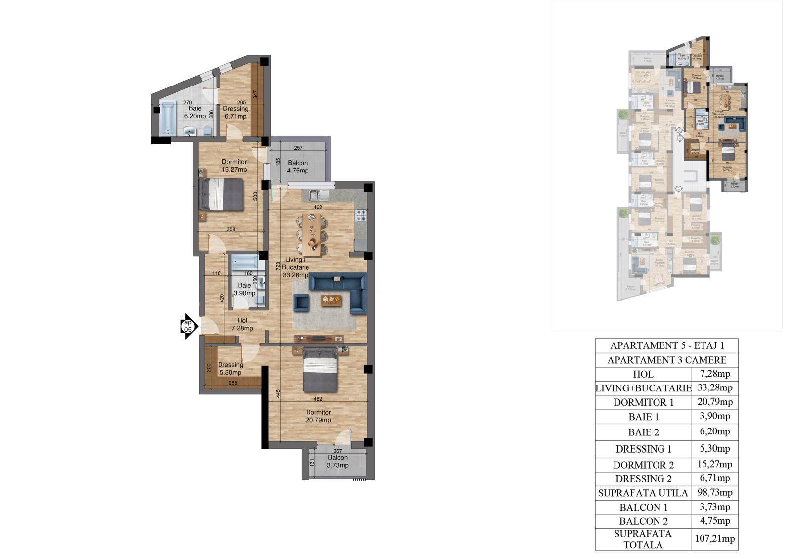 | 5 | 3 camere – Etaj 1 | 98.73 | 107.21 | Vândut |