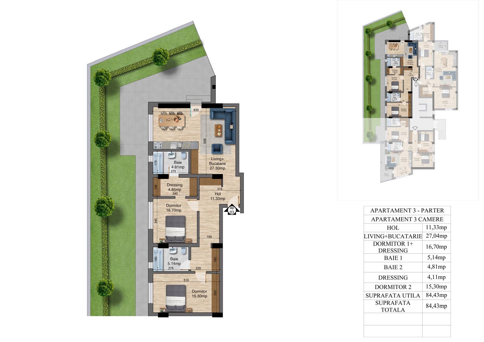 | 3 | 3 camere – Parter | 84 | 84 + 111 mp teren | Disponibil |