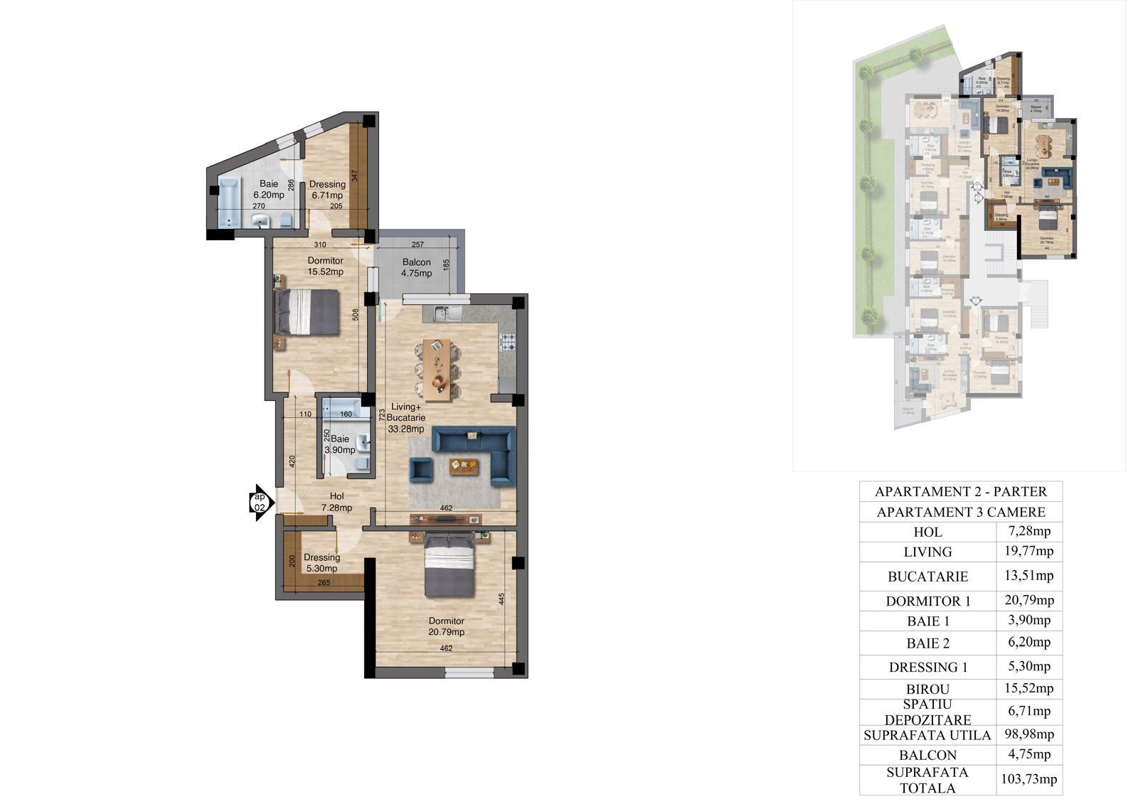 | 2 | 3 camere – Parter | 98 | 103 | Disponibil |