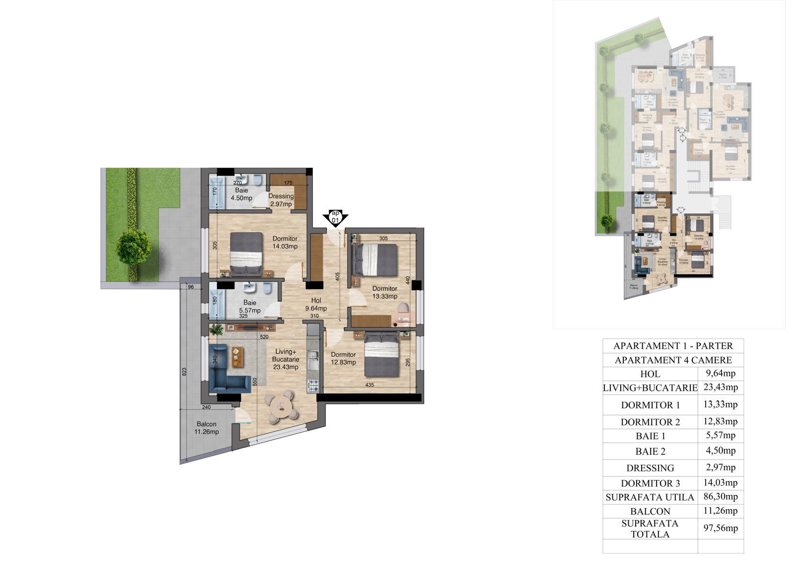 | 1 | 4 camere – Parter | 86 | 97 + 22 mp teren | Disponibil |