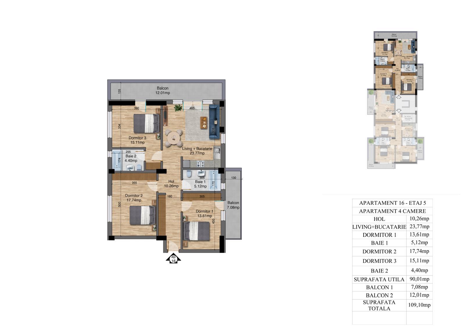 | 16 | 4 camere – Etaj 5 | 90.01 | 109.10 | Vândut |