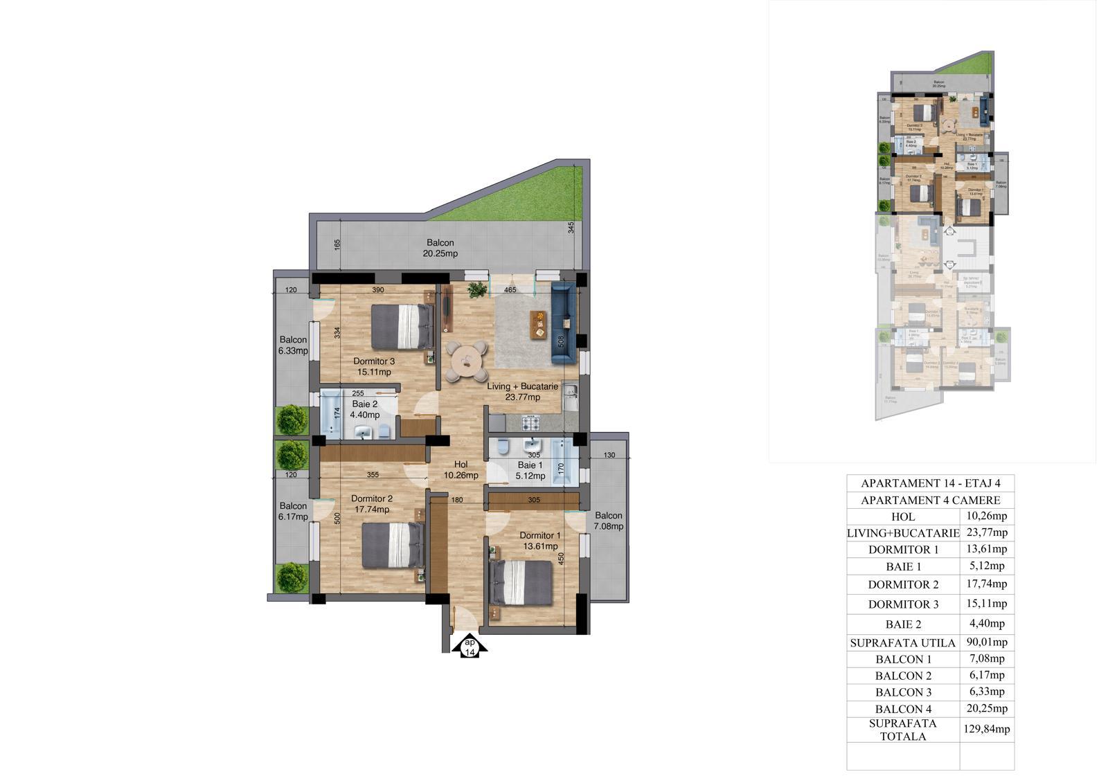 | 14 | 4 camere – Etaj 4 | 90.01 | 129.84 | Disponibil |