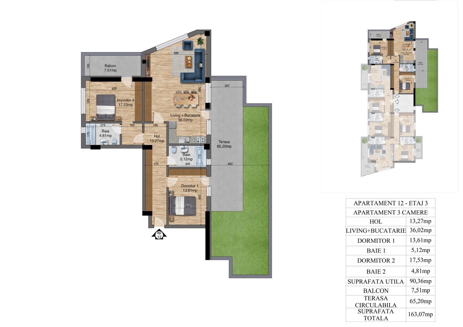 | 12 | 3 camere – Etaj 3 | 90.36 | 163.07 | Disponibil |