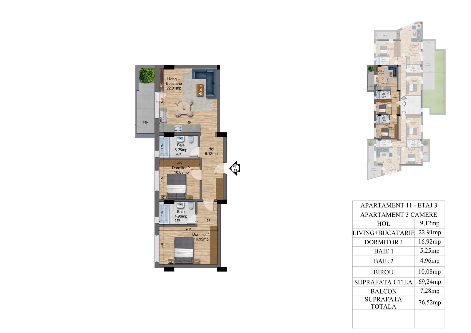 | 11 | 3 camere – Etaj 3 | 69.24 | 76.52 | Vândut |