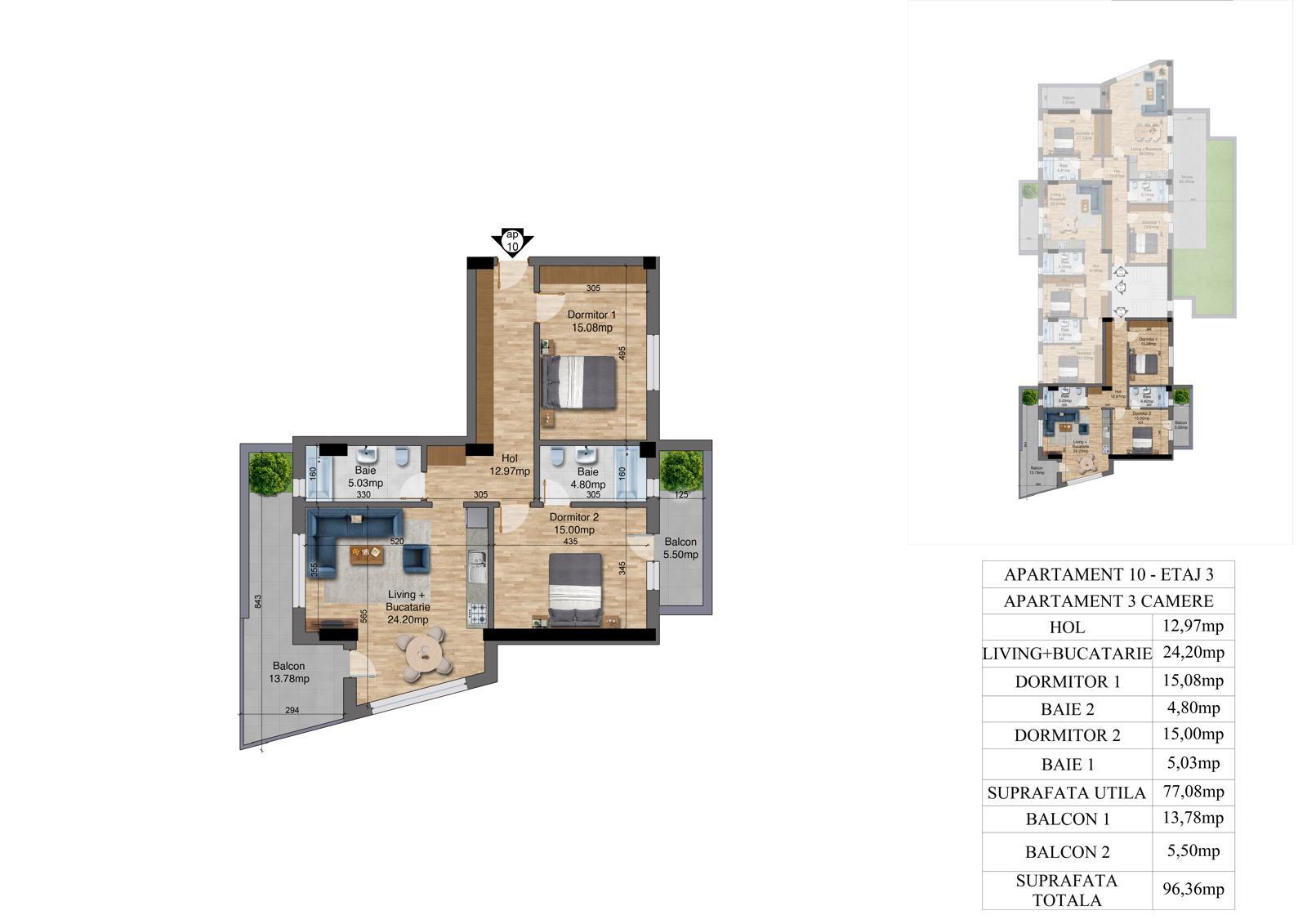 | 10 | 3 camere – Etaj 3 | 77.08 | 96.36 | Vândut |