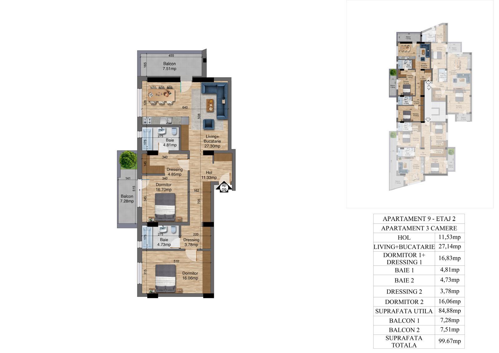 | 9 | 3 camere – Etaj 2 | 84.88 | 99.67 | Vândut |