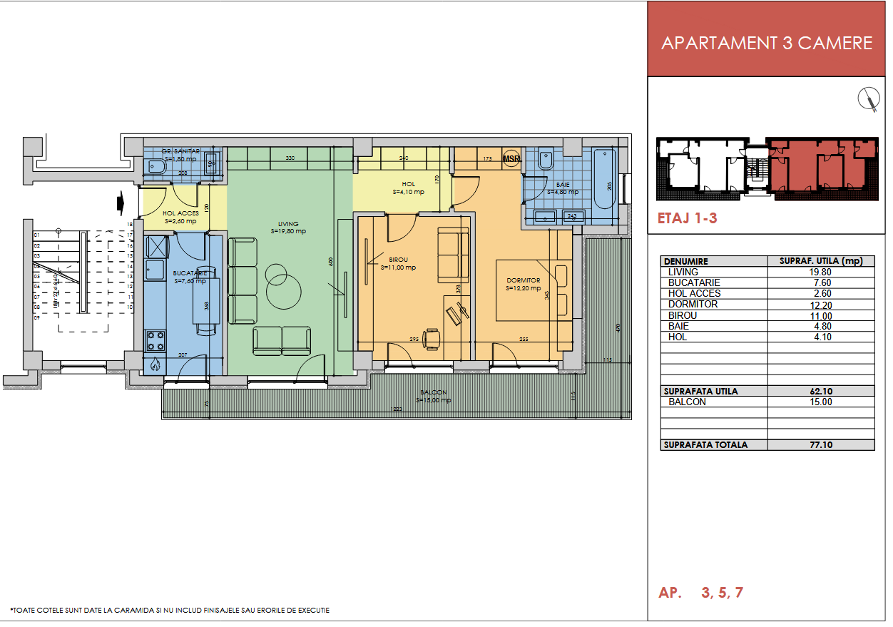 | 7 | 3 | Etaj 3 | 62.10 | 77.10 | 185.040 € |